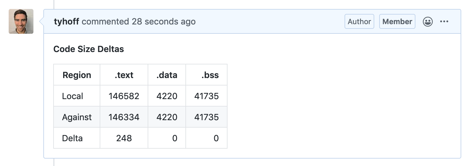 It turns out this pull-request adds roughly 250B to the master branch for our example firmware build! With this information in hand, the maintainers of the Zephyr Project can then decide whether the change is worth the bump in the firmware size. (I’d ✅)