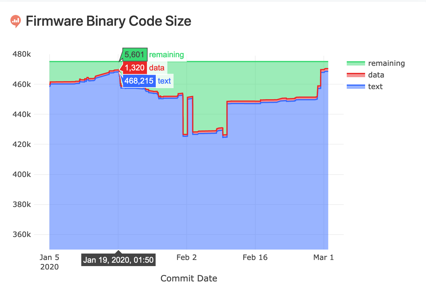 Below is an example of a type of dashboard we had. When we approached 5kB remaining in our firmware image, we knew what to do.